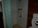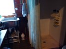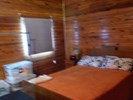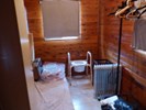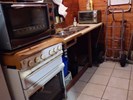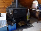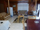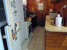 Living area with tiled floor. polished timber walls. Wood heater. Kitchen.